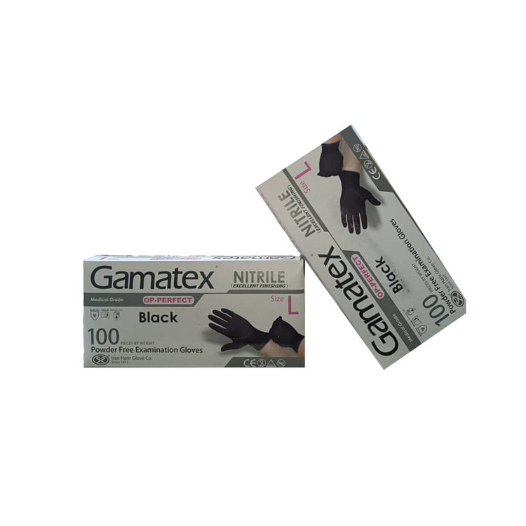 دستکش نیتریل مشکی گاماتکس بدون اسفاده از لاستیک مصنوعی ساخته شده است.